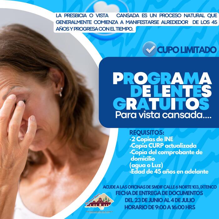 Este esfuerzo es impulsado por la presidenta honorífica del SMDIF, Alicia Caballero Yonca, en coordinación con el director del organismo, Raúl Hernández Gaspar, quienes informaron que este programa tiene como objetivo brindar gratuitamente lentes a personas mayores de 45 años que presentan síntomas de presbicia, también conocida como vista cansada, un proceso natural que comienza generalmente después de los 40 años.