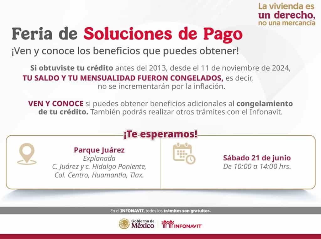DebatePúblico.- En un esfuerzo coordinado entre el gobierno municipal de Huamantla y el Instituto del Fondo Nacional de la Vivienda para los Trabajadores (Infonavit), este sábado 21 de junio se llevará a cabo la Feria de Soluciones de Pago, una estrategia institucional que busca acercar servicios, trámites y asesorías personalizadas a las y los trabajadores de la zona oriente del estado.