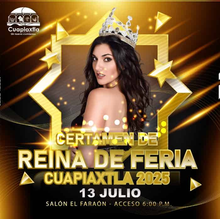 ✨ El H. Ayuntamiento te invita al Certamen de Reina de Feria Cuapiaxtla 2025, que se llevará a cabo el próximo 13 de julio en el Salón El Faraón.