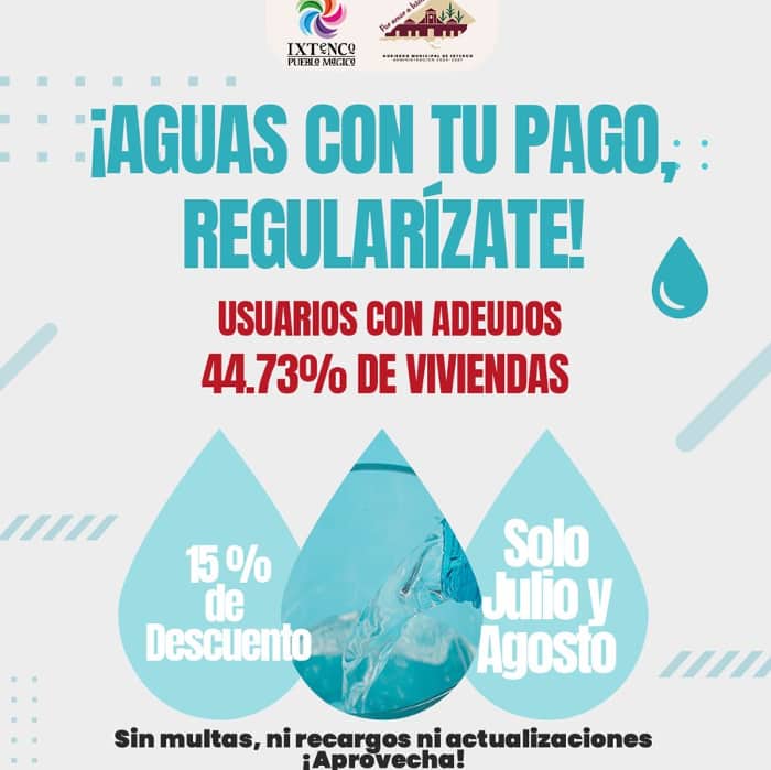 Con el propósito de garantizar la operatividad del sistema de agua potable y fomentar la corresponsabilidad ciudadana, el Gobierno Municipal de Ixtenco, encabezado por la presidenta Aline Lazo Caballero, puso en marcha la campaña “¡Aguas con tu pago, regularízate!”, que ofrece descuentos y facilidades a quienes presentan adeudos por el servicio de agua.
