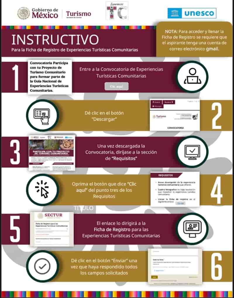 Para más información, se puede escribir al correo experienciasturisticas@sectur.gob.mx o comunicarse al número 55-3002-6300, extensiones 4728 y 4727, en un horario de atención de 10:00 a 18:00 horas.