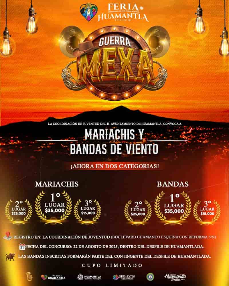 DebatePúblico.- En el marco de la Feria Internacional del Arte Efímero y la Dalia, el Ayuntamiento de Huamantla, a través de la Coordinación de Juventud, convoca a agrupaciones musicales a participar en el emocionante concurso Guerra Mexa, ¡ahora con dos categorías!