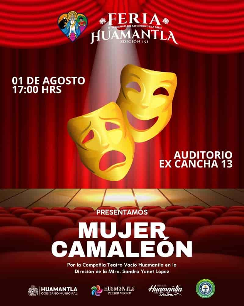 DebatePúblico.- En el marco de la Feria Internacional del Arte Efímero y de la Dalia Huamantla 2025, se presentó la obra de teatro “Mujer Camaleón”, una propuesta escénica cargada de simbolismo, fuerza y reflexión, a cargo de la Compañía de Teatro Vacío Huamantla, bajo la dirección de la Mtra. Sandra Yanet López.