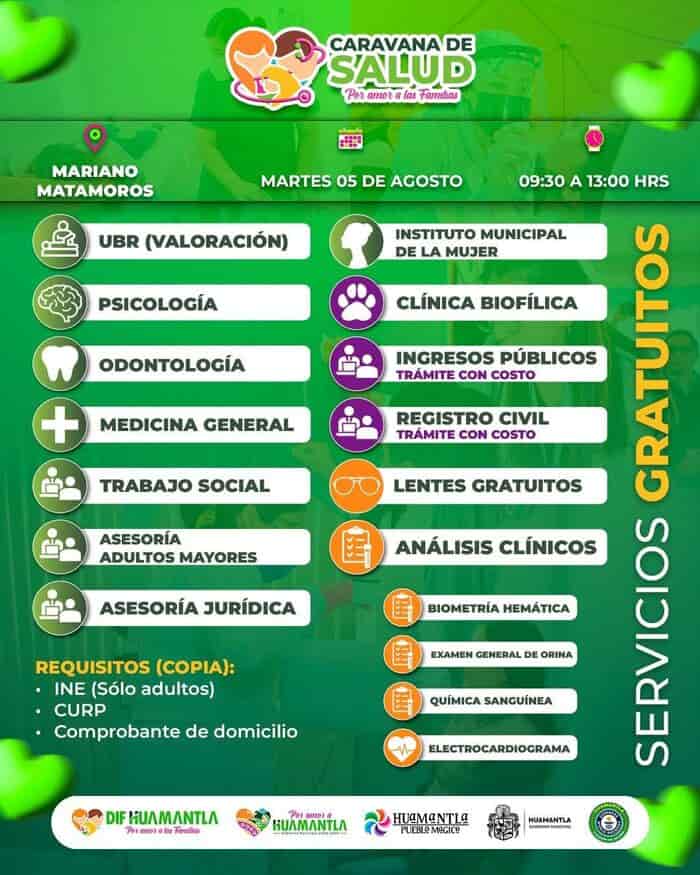 DebatePúblico.- Con el objetivo de acercar servicios esenciales y mejorar la calidad de vida de las familias huamantlecas, el Gobierno Municipal de Huamantla, que encabeza Salvador Santos Cedillo, a través del Sistema DIF Municipal, llevará a cabo este martes 5 de agosto una jornada más de la Caravana de Salud y Servicios en la comunidad de Mariano Matamoros.