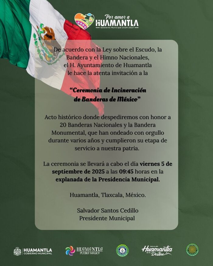 DebatePúblico.- En cumplimiento con la Ley sobre el Escudo, la Bandera y el Himno Nacionales, el Ayuntamiento de Huamantla invita a toda la ciudadanía a participar en la Ceremonia de Incineración de Banderas de México, un acto solemne en el que se rendirá homenaje a los símbolos patrios.