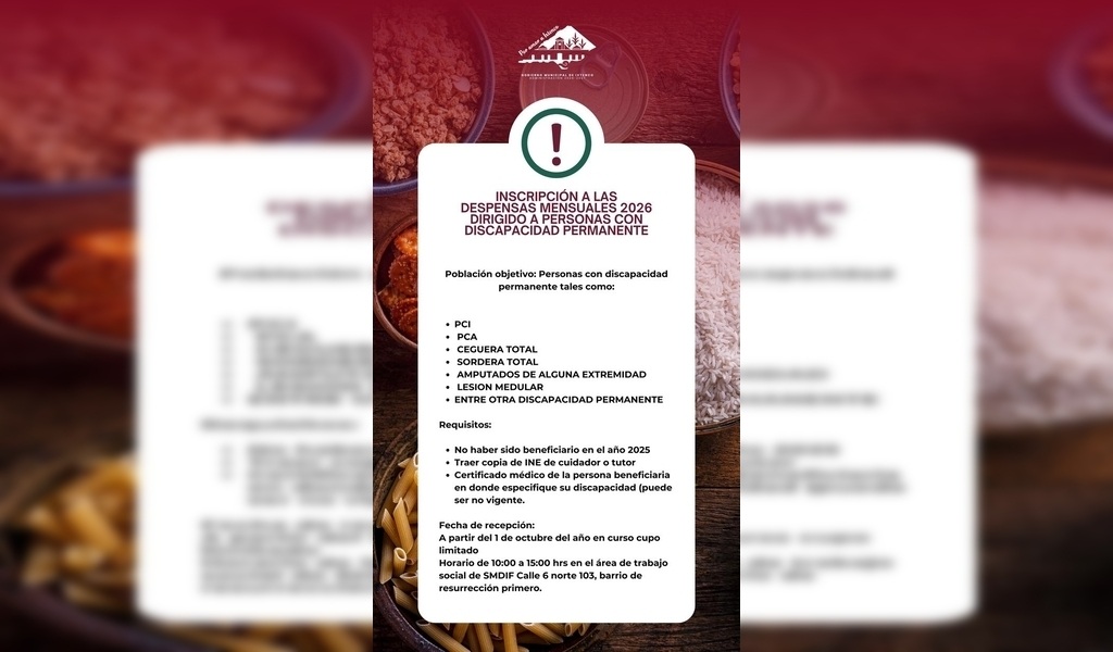 DebatePúblico.- El H. Ayuntamiento de Ixtenco, encabezado por la presidenta municipal Aline Lazo Caballero, en coordinación con el Sistema Municipal para el Desarrollo Integral de la Familia (SMDIF), que preside de manera honorífica Alicia Caballero Yonca y dirige Raúl Hernández Gaspar, anunció la apertura del Programa de Despensa Mensual 2026, el cual está dirigido a personas con discapacidad permanente.