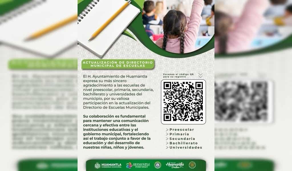 DebatePúblico.- El H. Ayuntamiento de Huamantla invita a todas las instituciones educativas de nivel preescolar, primaria, secundaria, bachillerato y universidades a participar en la actualización del Directorio Municipal de Escuelas, con el objetivo de mantener una comunicación más directa y efectiva con cada plantel.