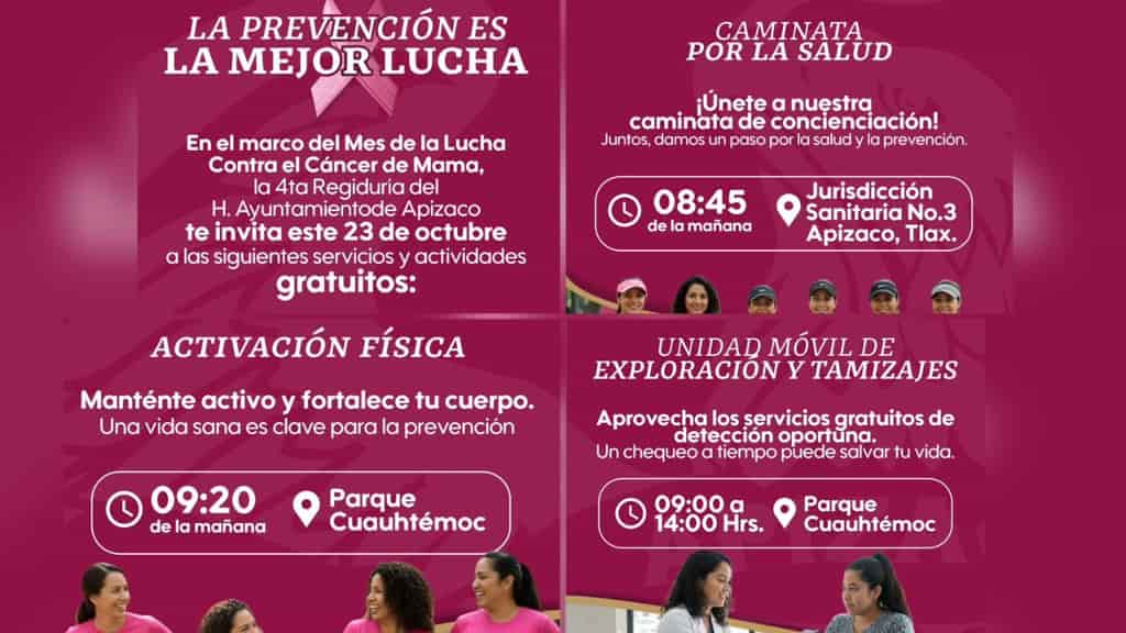 • El Ayuntamiento de Apizaco y la Cuarta Regiduría organizan actividades gratuitas este 23 de octubre para fomentar la detección oportuna y el autocuidado.