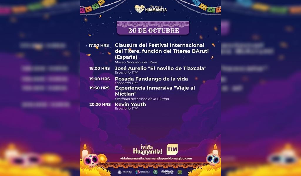 DebatePúblico.- El Ayuntamiento de Huamantla invita a la ciudadanía y visitantes a disfrutar de las actividades culturales que se llevarán a cabo este domingo 26 de octubre como parte del Festival Vida Huamantla, un proyecto que celebra nuestras tradiciones, el arte y la memoria colectiva en el marco del Día de Muertos.