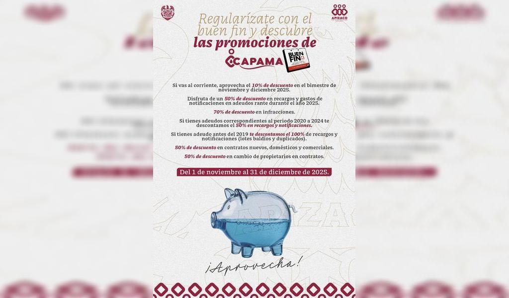 • El Ayuntamiento de Apizaco invita a la ciudadanía a aprovechar los beneficios del Buen Fin y las promociones por pago anual anticipado, disponibles del 1 de noviembre de 2025 al 28 de febrero de 2026.