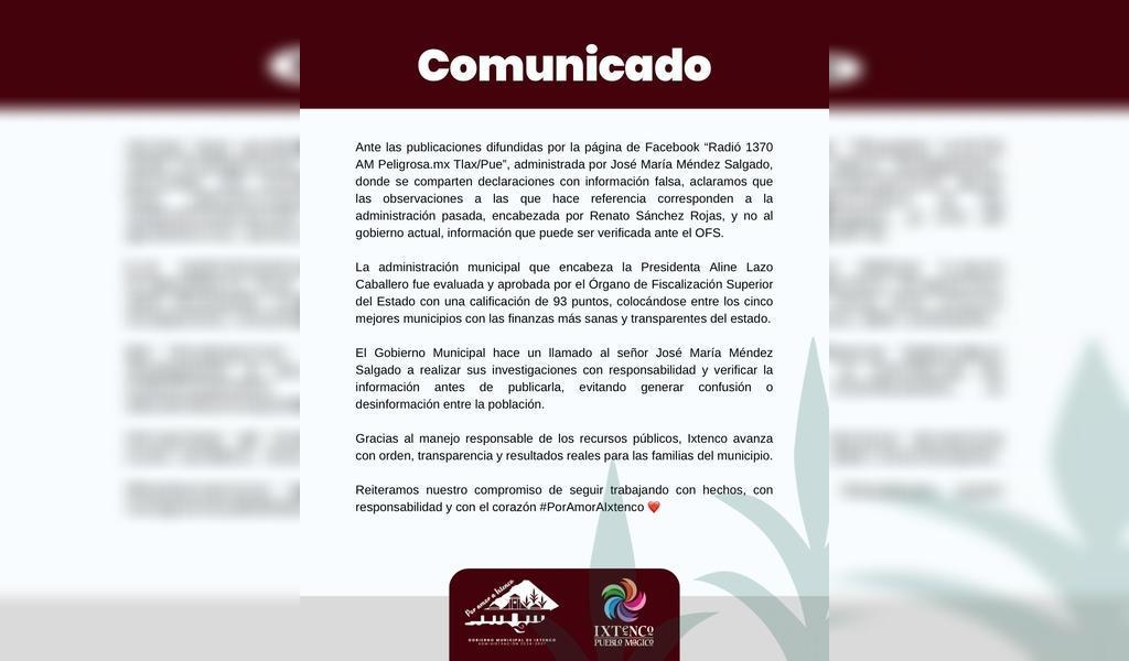 En este sentido, el H. Ayuntamiento de Ixtenco hace un llamado al señor José María Méndez Salgado y al medio “Radio 1370 AM Peligrosa.mx Tlax/Pue” a ejercer el periodismo con ética, verificar la información antes de difundirla y abstenerse de generar desinformación que confunde a la ciudadanía.