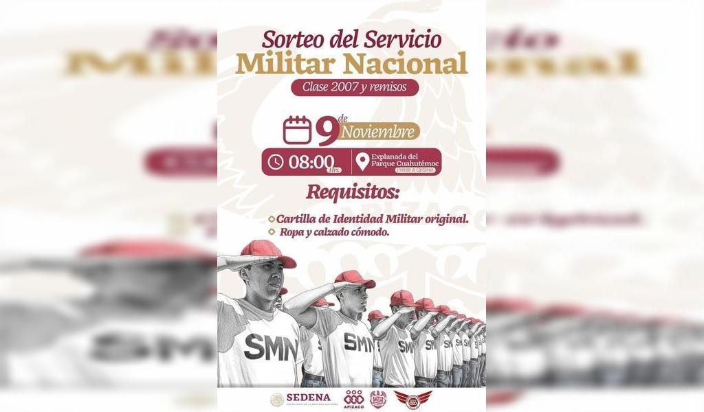 DebatePúblico.- El Gobierno Municipal de Apizaco, en coordinación con la Secretaría de la Defensa Nacional (Defensa) a través de la 23/a Zona Militar, convoca a los jóvenes que tramitaron su cartilla de identidad militar durante el presente año, clase 2007 y remisos, a participar en el sorteo del Servicio Militar Nacional, que se realizará el domingo 9 de noviembre de 2025, a las 08:00 horas, en la explanada del parque Cuauhtémoc.