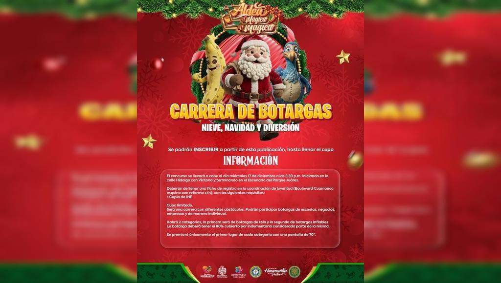 DebatePúblico.- El Gobierno Municipal de Huamantla, que encabeza Salvador Santos Cedillo, a través de la Coordinación de Juventud, invita a escuelas, negocios, empresas y ciudadanía en general a participar en la tradicional Carrera de Botargas “Nieve, Navidad y Diversión”, que se realizará el miércoles 17 de diciembre a las 5:30 p.m.