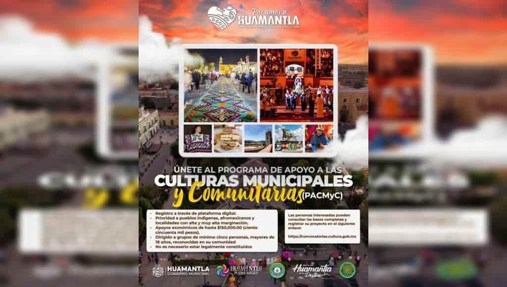 DebatePúblico.- El Gobierno Municipal de Huamantla que encabeza Salvador Santos Cedillo, a través de la Dirección de Turismo, Cultura y Desarrollo Taurino, reitera la invitación a participar en la convocatoria del Programa de Apoyos a las Culturas Municipales y Comunitarias (PACMyC) 2026, emitida por la Secretaría de Cultura.