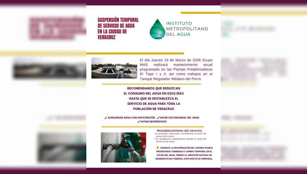 DebatePúblico.- Debido al mantenimiento preventivo anual en las plantas potabilizadoras El Tejar I y II y en el tanque regulador Médano del Perro, el Instituto Metropolitano del Agua (IMA) exhorta a la ciudadanía a tomar previsiones ante la suspensión temporal del servicio de agua potable en toda la ciudad de Veracruz, el próximo jueves 19 de marzo, por lo que recomienda almacenar agua con anticipación y hacer un uso racional del vital líquido.