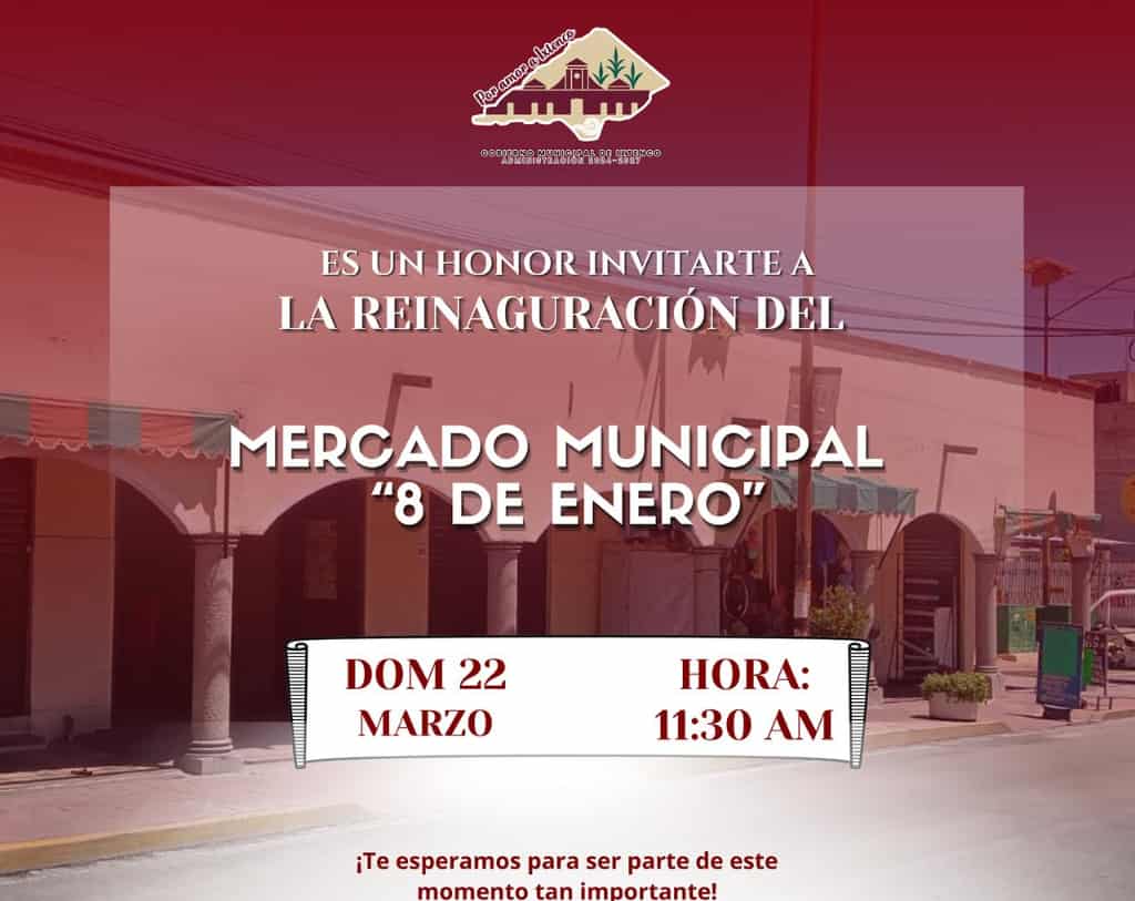 DebatePúblico.- El Gobierno Municipal de Ixtenco informa que el próximo domingo 22 de marzo a las 11:30 horas se llevará a cabo la reinauguración del Mercado Municipal “8 de Enero”, un espacio que será reactivado para fortalecer la economía local y ofrecer a la ciudadanía instalaciones dignas, limpias y funcionales.