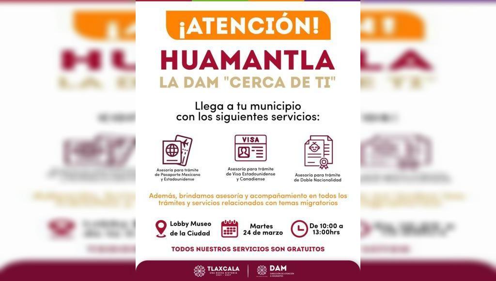 DebatePúblico.- Con el objetivo de acercar servicios y orientación a las familias huamantlecas, el Gobierno Municipal de Huamantla informa que este martes se contará con la presencia de la Dirección de Atención a Migrantes (DAM) del Gobierno del Estado de Tlaxcala, quien brindará atención directa a la ciudadanía.