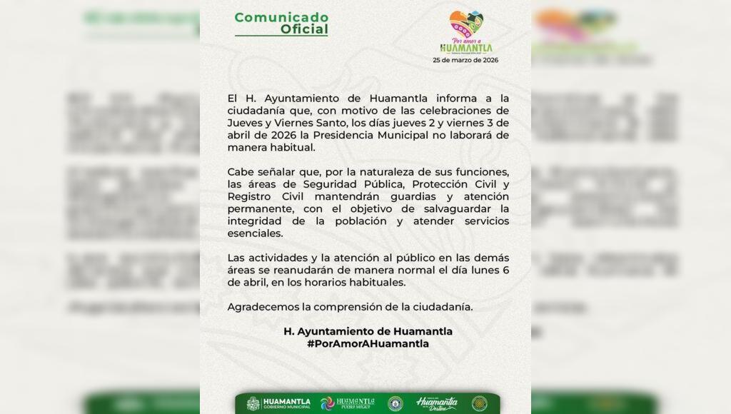 DebatePúblico.- El H. Ayuntamiento de Huamantla informa a la ciudadanía que, con motivo de las celebraciones de Jueves y Viernes Santo, los días jueves 2 y viernes 3 de abril de 2026 la Presidencia Municipal no laborará de manera habitual.