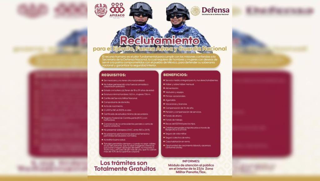 DebatePúblico.- El Ayuntamiento de Apizaco te invita a participar en el proceso de reclutamiento para el Ejército, Fuerza Aérea y Guardia Nacional. Una opción para desarrollarte, acceder a beneficios y formar parte de una institución al servicio del país.