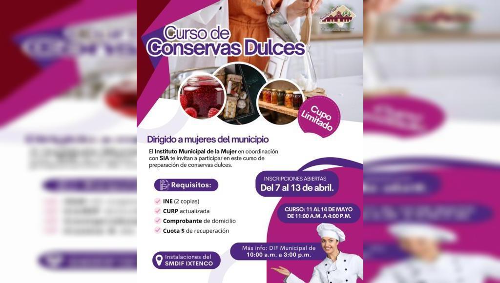 DebatePúblico.- Con el objetivo de fortalecer las habilidades productivas y fomentar el emprendimiento entre las mujeres del municipio, el Gobierno Municipal de Ixtenco, encabezado por la presidenta municipal Aline Lazo Caballero, a través del Instituto Municipal de la Mujer dirigido por Lucía Aguilar Angoa, invita a participar en el curso de “Conservas Dulces”.
