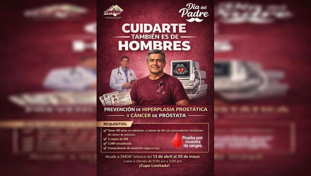 La jornada contempla la recepción de documentos del 13 de abril al 20 de mayo, en un horario de lunes a viernes de 9:00 a 15:00 horas en las instalaciones del SMDIF Ixtenco. Los requisitos son: contar con 40 años o más, o ser menor con antecedentes familiares de cáncer de próstata, así como presentar copia de INE, CURP actualizada y comprobante de domicilio.