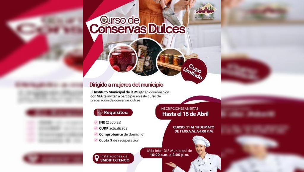 DebatePúblico.- El Gobierno Municipal de Ixtenco hace un llamado a las mujeres del municipio a aprovechar los últimos días de inscripción al Curso de Conservas Dulces, impulsado por el Instituto Municipal de la Mujer en coordinación con SIA.