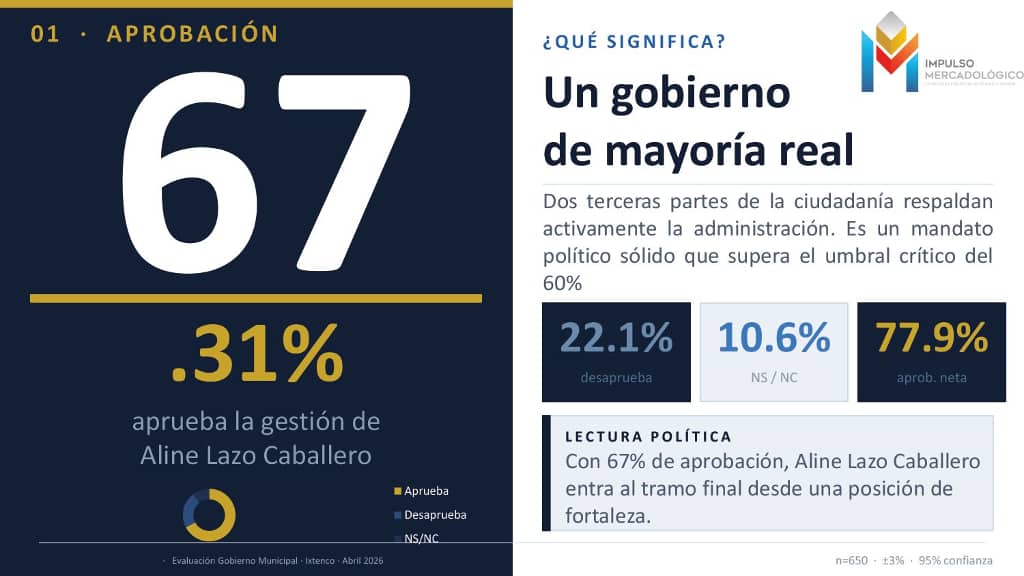 El estudio, basado en 650 entrevistas cara a cara en vivienda, confirma un respaldo sólido hacia la gestión de la presidenta municipal Aline Lazo Caballero. En contraste, el 22.12% manifestó desaprobación, mientras que un 10.58% no expresó opinión, lo que refuerza un escenario de ventaja clara en la percepción pública.