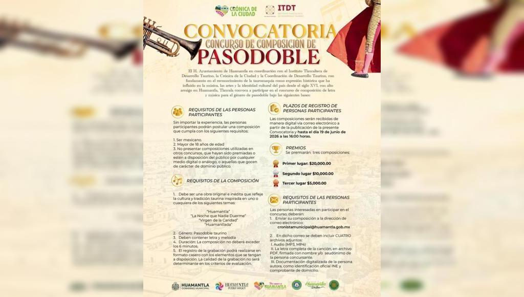 La convocatoria está dirigida a personas mayores de 18 años, quienes podrán participar con una obra original e inédita que incluya letra y música, inspirada en temas emblemáticos como “Huamantla”, “La Noche que Nadie Duerme”, “Virgen de la Caridad” o “Huamantlada”. Las composiciones deberán pertenecer al género pasodoble taurino y tener una duración máxima de seis minutos.