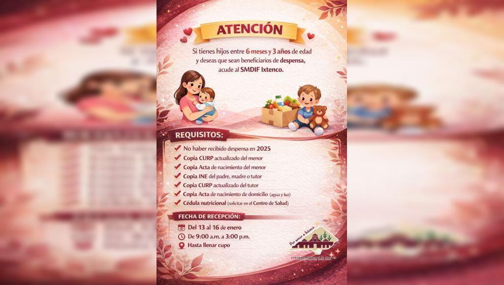 DebatePúblico.- El Sistema Municipal para el Desarrollo Integral de la Familia (SMDIF) Ixtenco anunció el inicio del periodo de recepción de documentos para que niñas y niños de 6 meses a 3 años de edad puedan ser beneficiarios del programa de apoyo de despensa, dirigido a fortalecer la nutrición y bienestar de la primera infanciaSigueSigue leyendo «SMDIF Ixtenco invita a padres de familia a inscribir a sus hijos al programa de apoyo alimentario»