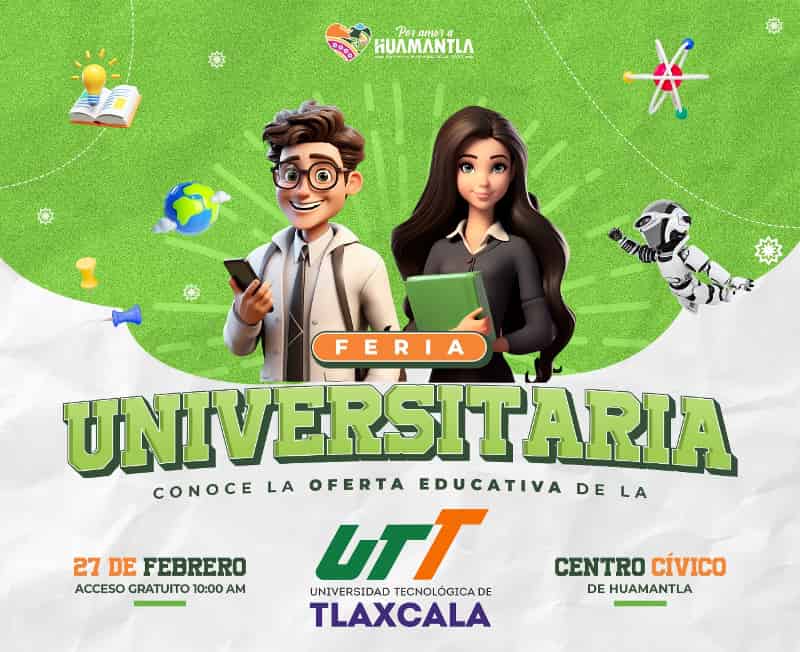 DebatePúblico.- El Gobierno de Huamantla extiende una cordial invitación a toda la juventud del municipio y sus alrededores para asistir a la feria organizada por la Universidad Tecnológica de Tlaxcala (UTT), la cual se llevará a cabo el próximo jueves 27 de febrero de 2025, a partir de la 10:00 horas, en el Centro CívicoSigueSigue leyendo «GOBIERNO DE HUAMANTLA INVITA A FERIA UNIVERSITARIA DE LA UTT PARA OFRECER OPCIONES DE ESTUDIO A JÓVENES»