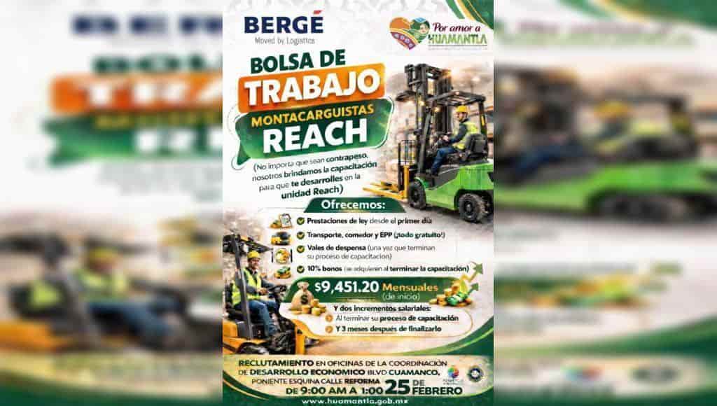 IMPULSA GOBIERNO DE HUAMANTLA RECLUTAMIENTO PARA MONTACARGUISTAS REACH ESTE 25 DE FEBRERO