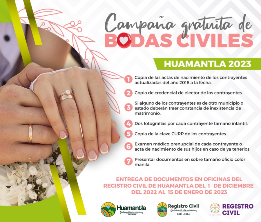 · Con estas acciones se protegen los derechos de los hijos, se obtiene certeza jurídica en las parejas, y se fortalece el núcleo familiar. DebatePúblico.- Desde el pasado primero de diciembre del presente año, las oficinas del Registro Civil del municipio comenzaron a recibir la documentación de parejas que quieren regularizar su estado civil y tenerSigueSigue leyendo «TIENEN PAREJAS HASTA EL 15 DE ENERO PARA ENTREGAR SUS DOCUMENTOS EN LA CAMPAÑA GRATUITA DE BODAS CIVILES»