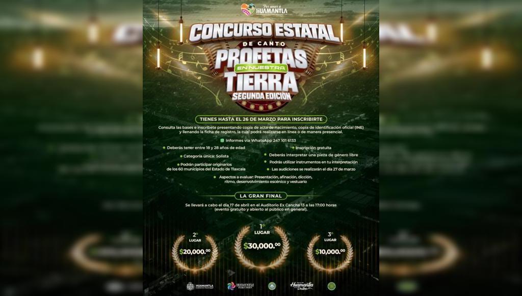 La convocatoria está dirigida a jóvenes de entre 18 y 28 años de edad de todo el estado de Tlaxcala DebatePúblico.- El Gobierno del Municipio de Huamantla, a través de la Dirección de Bienestar y la Coordinación de Juventud, convoca al concurso estatal de canto “Profetas en Nuestra Tierra”, una iniciativa que busca impulsar elSigueSigue leyendo «GOBIERNO MUNICIPAL DE HUAMANTLA IMPULSA EL TALENTO JUVENIL CON CONCURSO ESTATAL DE CANTO “PROFETAS EN NUESTRA TIERRA”»