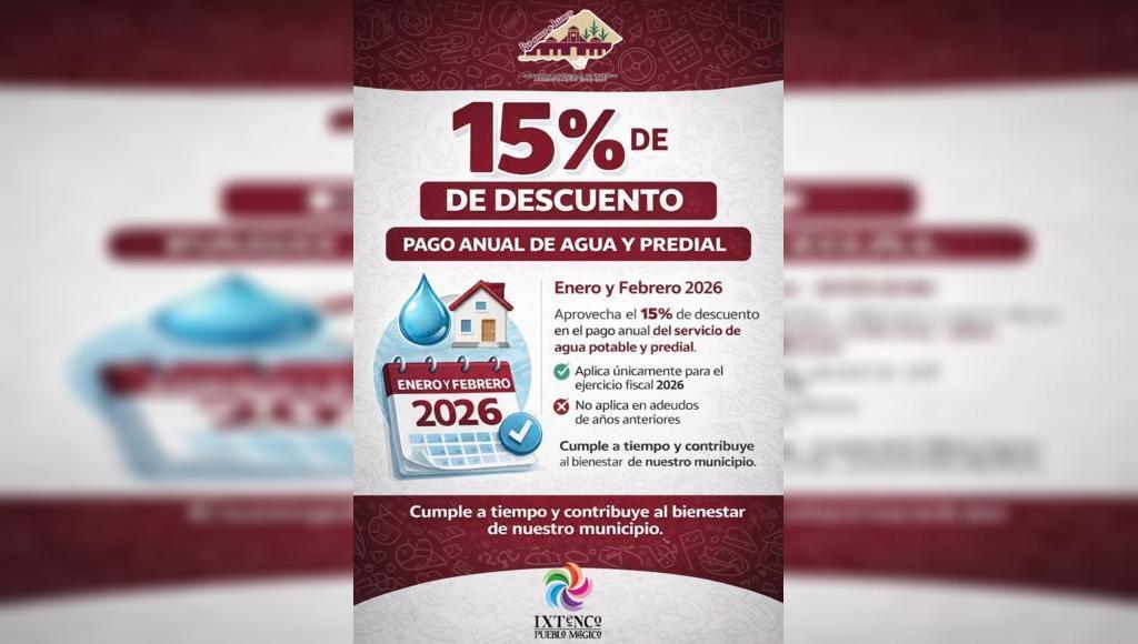 DebatePúblico.- El Gobierno Municipal de Ixtenco informa a la ciudadanía que durante los meses de enero y febrero de 2026 se encuentra vigente un 15% de descuento en el pago anual de los servicios de agua potable y predial, correspondiente al ejercicio fiscal 2026. En este sentido, la presidenta municipal Aline Lazo Caballero exhortó aSigueSigue leyendo «Ixtenco invita a aprovechar el 15% de descuento en el pago anual de agua potable y predial»
