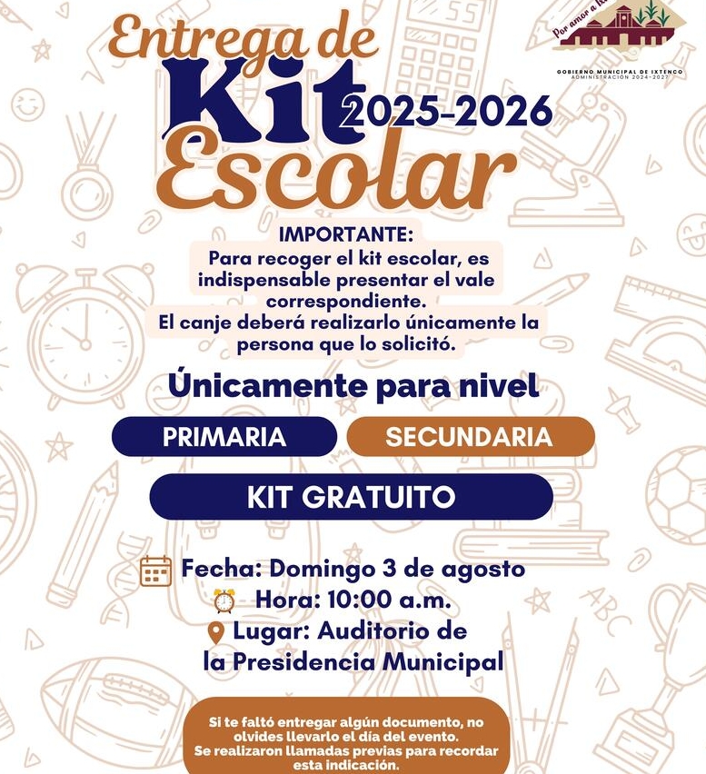 DebatePúblico.- Con el firme compromiso de apoyar la economía familiar y fortalecer el acceso a la educación, el Gobierno Municipal de Ixtenco, encabezado por la presidenta Aline Lazo Caballero, realizará este domingo 3 de agosto la entrega de más de mil kits escolares a estudiantes de nivel primaria y secundaria. La entrega se llevará aSigueSigue leyendo «Este domingo 3 de agosto, Gobierno de Ixtenco entregará más de mil kits escolares a estudiantes de nivel básico»