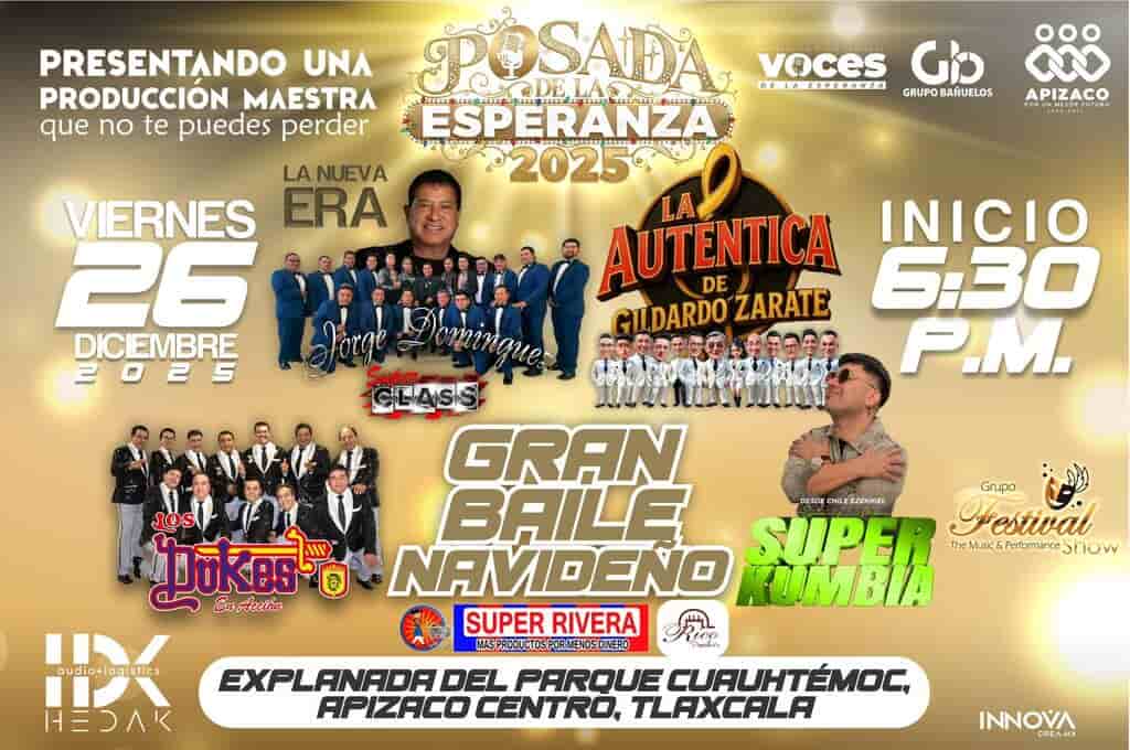 DebatePúblico.- El Ayuntamiento de Apizaco, bajo el liderazgo del presidente Javier Rivera Bonilla, en colaboración la Asociación Civil Voces de la Esperanza Tlaxcala anuncian un cartel musical de cinco agrupaciones para la Posada de la Esperanza. Se presentarán Jorge Domínguez y Super Class, La Auténtica Sonora de Gildarlo Zárate, Los Dukes en Acción, La SúperSigueSigue leyendo «Cinco Grupos Musicales en la Posada de la Esperanza, en Apizaco el viernes 26 de Diciembre»