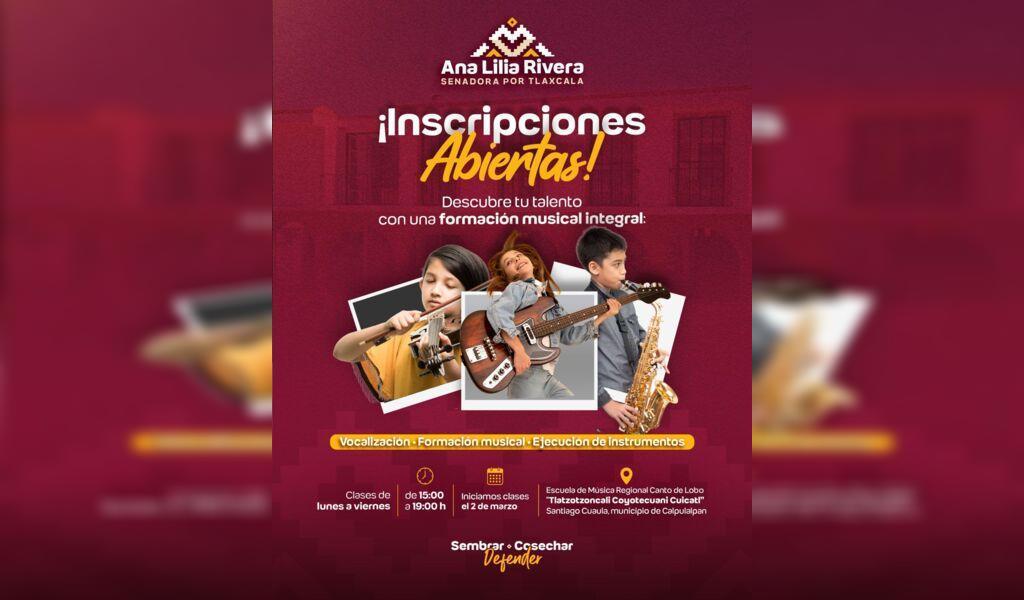 – Los cursos iniciarán el 2 de marzo y el plan de estudios de tres años está enfocado en formación musical integral y acceso incluyente a la cultura DebatePúblico.- La senadora Ana Lilia Rivera Rivera hizo un nuevo llamado a las niñas, niños y jóvenes de la zona poniente del estado de Tlaxcala, a inscribirseSigueSigue leyendo «Reitera Ana Lilia Rivera invitación para inscribirse a la Escuela de Música Regional “Canto del Lobo”»