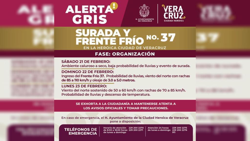 DebatePúblico.- La dirección de Protección Civil del Ayuntamiento de Veracruz activa la Alerta Gris en Fase de Organización, ante el pronóstico de surada para este sábado, así como la entrada del Frente Frío número 37 a partir del domingo, dando lugar a un evento de norte violento y descenso de temperatura en la ciudad. EnSigueSigue leyendo «Emite PC de Veracruz alerta gris por surada y norte violento este fin de semana en la ciudad»