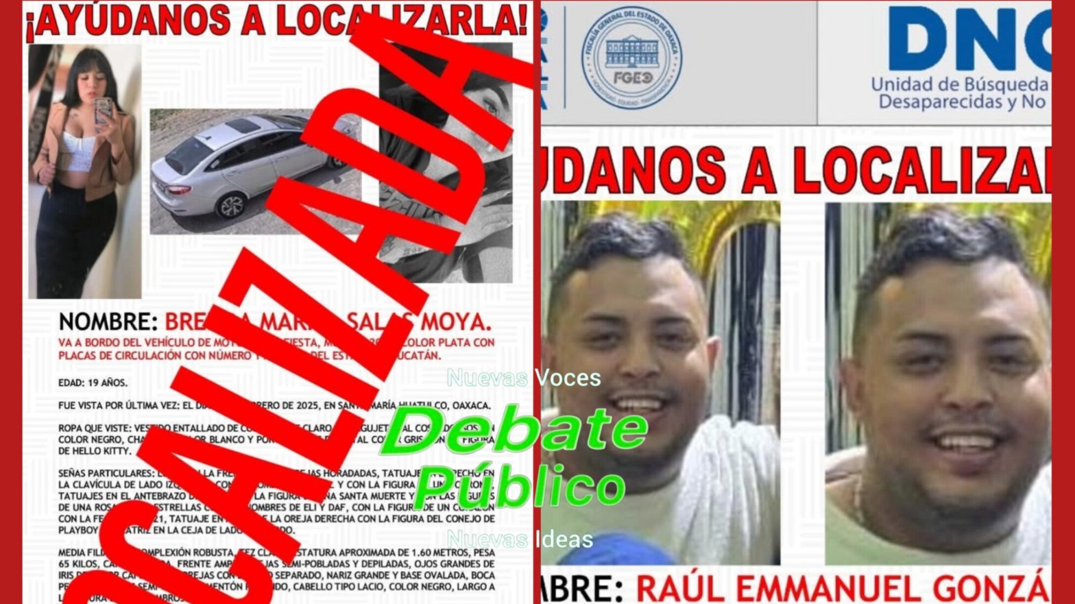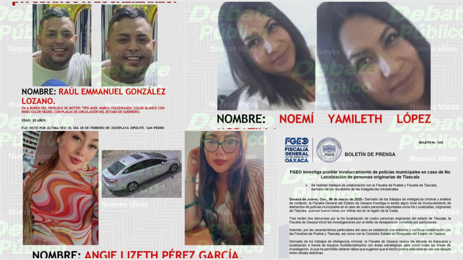 DebatePúblico por Manuel Rojas.- La fiscalía General de Justicia del Estado de Oaxaca informó que se investiga «si existe algún nivel de involucramiento de elementos de policías municipales en el caso de cuatro personas reportadas como No Localizadas, originarias de Tlaxcala, quienes fueron vistas por última vez en la región de la Costa». La DependenciaSigueSigue leyendo «Investigan a policías municipales de Oaxaca por desaparición de tlaxcaltecas»