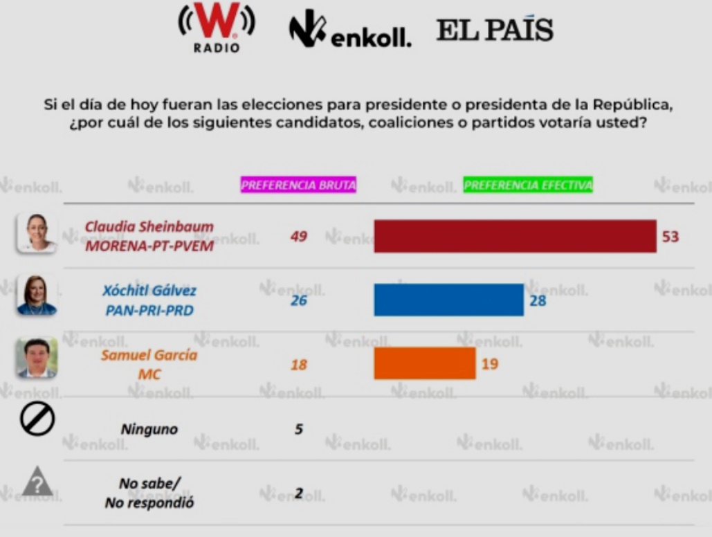 DP.- De acuerdo a la encuesta ‘Rumbo a la Presidencia de la República’ de Enkoll para W Radio y El País, Claudia Sheinbaum, virtual candidata de Morena, Partido del Trabajo (PT) y el Partido Verde Ecologista (PVEM), es quien encabeza la preferencia del voto, con el 49%. Mientras que Xóchitl Gálvez, contendiente por el Frente Amplio por México, se mantiene con elSigueSigue leyendo «Claudia Sheinbaum a la cabeza de la intención del voto, Xóchitl se mantiene»