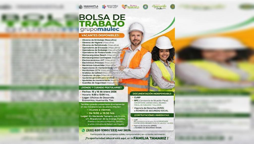 DebatePúblico.- Con el propósito de acercar oportunidades laborales a la población, el Gobierno Municipal de Huamantla, a través de la Coordinación de Desarrollo Económico, invita a participar en la jornada de reclutamiento de Grupo Maulec, con el objetivo de generar más y mejores oportunidades laborales y fortalecer la economía local. Esta convocatoria contempla diversas vacantesSigue leyendo "GOBIERNO DE HUAMANTLA ACERCA OPORTUNIDADES LABORALES A LA POBLACIÓN CON JORNADA DE RECLUTAMIENTO DE GRUPO MAULEC"